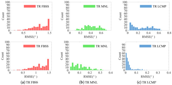 RMSE histograms of the three algorithms (The top subplots are RMSE histograms of the three algorithms at SNR = 0 dB, while the bottom subplots are RMSE histograms of the three algorithms at SNR = 10 dB).