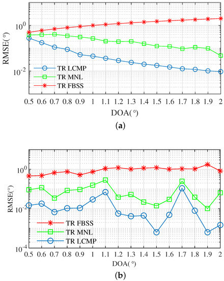 As the SNR increases, the RMSE’s distribution range obtained by TR FBSS is almost unchanged (see Figure 3a) and is far away from the actual DOA in most cases. The result suggests that TR FBSS is not suitable for diffuse multipath environments. On the contrary, the obtained RMSE distribution intervals by the other two algorithms are significantly reduced with the increase of the SNR, which means the algorithm performance is improved consequently (see Figure 3b,c). Besides, the maximum RMSE values of the proposed algorithms under the two SNRs are less than the maximum RMSE values of the TR MNL algorithm. The proposed algorithm has apparent advantages comparing with the other two algorithms.