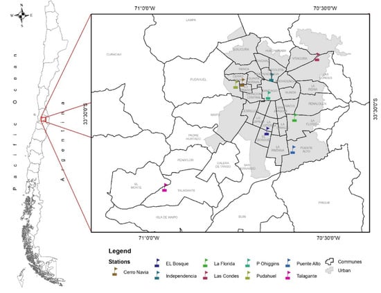 Stations Puente Alto and Las Condes were closer in their coefficients, coinciding with the fact that, except for Talagante, they are the furthest stations away from the central urban nucleus, and both are found in the eastern sector of the city, in the foothills of the Andes Mountains (Figure 1).