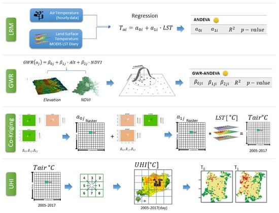The methodological scheme is divided into four steps: Step 1 is in regards to linear regression models (LRM) estimating air temperature from land surface temperature. After that, it is necessary to consider the estimation of LRM parameters considering their spatial position using geographic weighted models (Step 2). In Step 3, we use bivariate interpolation models as a cokriging to estimate the air temperature for each pixel of the area. Finally (Step 4), the urban heat island (UHI) is calculated for different dates, studying its behavior in all periods.