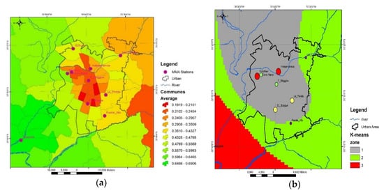 To calculate the heat island, we used the Talagante weather station as a reference, given that it is a rural area around Santiago. Complementarily, this selection was validated through cluster analysis on the spatialized air temperature coefficients (a0 and a1), and a zonal statistical calculation to a commune scale level using the mean maximum NDVI during the period of analysis. The NDVI presents a high inverse correlation with thermal emissivity [36,37], which demonstrates thermal differences between rural and urban areas if the former has a higher presence of vegetation.