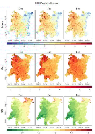 Daytime urban heat islands (based on daily data from 2005 to 2017). UHI is calculated from the difference between the pixels and the rural station of reference (Talagante station). The first row shows the mean monthly temperatures of December, January, and February; the central row shows the average of the maximum temperature of the same period; the last row shows the average standard deviation of temperatures. Mean: Heat increases in intensity towards the northwest zones as February approaches, while also advancing to the center of the city. Max: The maximum temperature behavior in December and February are similar, but January has the maximum higher temperature towards the west zone. SD: The standard deviation increases from southwest to northeast; this trend continues from December to February, decreasing variability towards the end of summer.