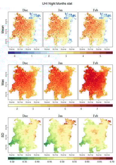 Temperature at the Talagante station is subtracted from the modelled temperature in each pixel for each day and night. In this manner, the values represented in the UHI imagery correspond to the differences between temperatures in a rural area and an urban one. Finally, to improve spatio-temporal analysis, calculations were carried out based on the images of average, maximum UHI, and standard deviations on a monthly scale and during the summer seasons.