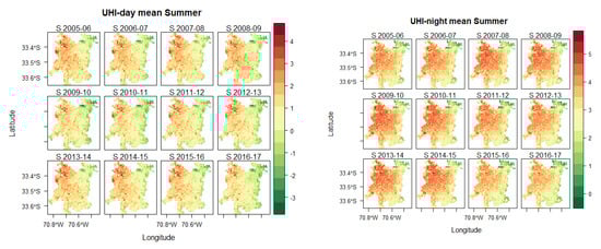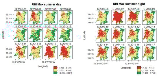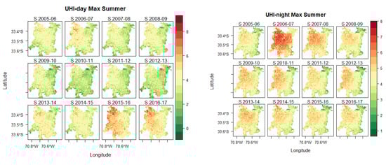 Maximum daytime and nighttime UHIs for the 2005–2017 summer seasons. Each summer season considers the months of December from the previous year and January and February of the following year (e.g., S 2005–2006 means December 2005 and January and February 2006). The graph shows the maximum day and night temperatures over three months. During the maximum days in 2006–2007, there are high values mainly in the northwest, while at night during the same summer the UHI almost covers the entire city, probably due to the heat waves that occurred at that time. Conversely, during the summer days in 2015–2016 and 2016–2017, the UHI is higher than during the night.