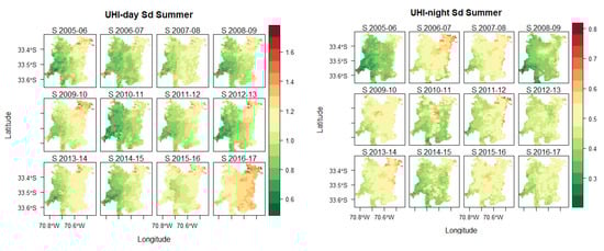 Regarding temperature variability of the UHI during the summers of 2005–2017 (Figure 8), the results demonstrate that there was minor variability in the southwest sector of the city, and large variations in the 2016–2017 summer in comparison with the rest of the summers. Nocturnal variation increases occurred in the northeast sector, mostly during the summers of 2006–2007 and 2007–2008. The variability magnitude was greater during the day than during the night, and a central nucleus was maintained during summer nocturnal periods.