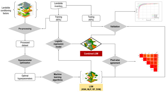 The process of evaluating spatial agreement among various machine learning technique-based landslide susceptibility maps and optimizing the landslide prediction map. LSM = landslide susceptibility maps; KNN = K-Nearest Neighbor; MLP = Multi-Layer Perceptron; RF = Random Forest; SVM = Support Vector Machine.