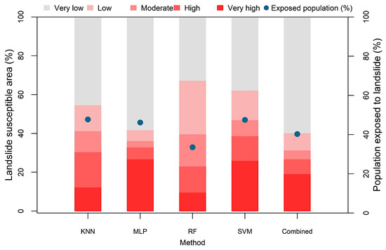 Landslide susceptible area obtained using five models: K-Nearest Neighbor (KNN), Multi-Layer Perceptron (MLP), Random Forest (RF), Support Vector Machine (SVM), and combined model. Blue dots indicate the proportion of people exposed to ‘high’ and ‘very high’ susceptible zones.