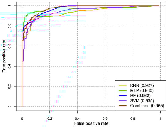 Receiver operating characteristic (ROC) curves of the five models: K-Nearest Neighbor (KNN), Multi-Layer Perceptron (MLP), Random Forest (RF), Support Vector Machine (SVM), and combined model.