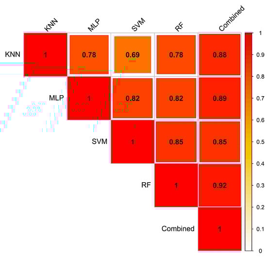 Correlogram to show the agreement between the five landslide susceptibility models: K-Nearest Neighbor (KNN), Multi-Layer Perceptron (MLP), Random Forest (RF), Support Vector Machine (SVM), and combined model.
