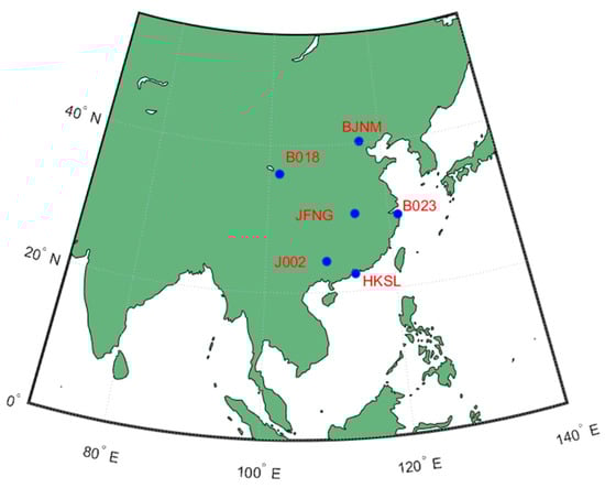 In this study, three refinement models with different station counts were built and analyzed. The stations used by different models are listed in Table 2. The first model was the refined real-time global ionospheric model with one station (RRTGIM-1), which only used one station named HKSL. RRTGIM-3 used three stations: HKSL, B023, and BJNM. For RRTGIM-6, six stations were used, i.e., HKSL, B023, BJNM, JFENG, J002, and B018. The distribution of these stations is shown in Figure 1. The observation data from day of year (DOY) 78 to 99, 2020, were collected for modeling. The recorded GNSS constellation, sample rate, receiver, and antenna of these stations are listed in Table 3.