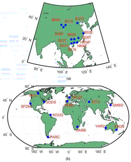 Global distribution of 24 validation stations: (a) distribution of 12 GNSS stations in China and (b) distribution of 12 IGS GNSS stations across the world.