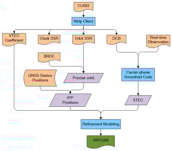 The procedure of refinement modeling is shown in Figure 4. As shown in the figure, CLK93 SSR messages, including ionospheric VTEC coefficient, clock corrections, orbit corrections, code bias, and phase bias, are received and decoded via the SGGNtrip client, which is a RTCM networked transport via an Internet protocol (NTRIP) client developed at the School of Geodesy and Geomatics (SGG), Wuhan University []. There are four steps required to conduct the refinement: