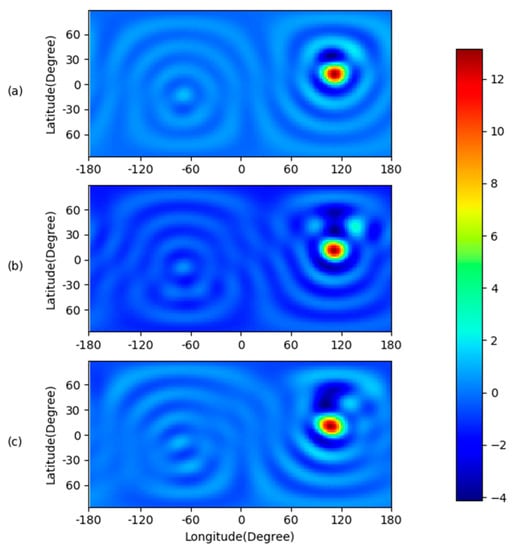About 100 real-time IGS GNSS stations were used in the real-time ionospheric VTEC model. The order of spherical harmonic moved from 6 to 12 on May 29, 2018. Quality assessment results showed that the root mean square errors (RMSE) of CNES varied from 2 to 6 TECU [,]. The accuracy of VTEC was nonuniform because the real-time GNSS stations were uneven for different regions. Some regions like Western Europe and North America are covered with reference stations. Nevertheless, in regions like Asia, Africa, Latin America, and other sea areas, IGS stations are sparse.