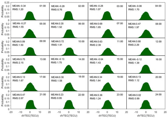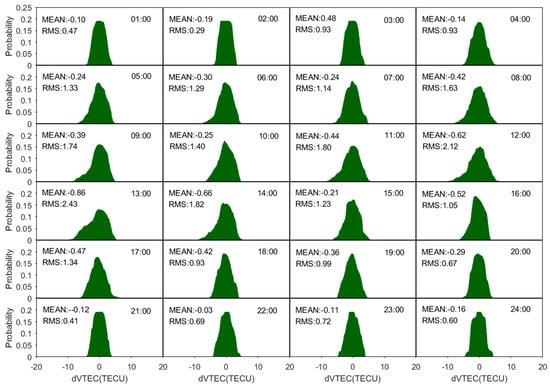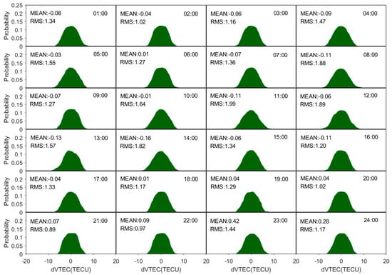 The modeling procedure is referred to in Figure 4. Post-residual errors of refinement modeling were used to assess internal coincidence accuracy. Histograms of residual errors in a 1 h interval are shown in Figure 7, Figure 8 and Figure 9. The root mean square (RMS) and mean values are calculated as well. The maximum RMS of the three models was 2.39, 2.43, and 1.99 TECU, where the minimum RMS was 0.76, 0.29, and 0.89 TECU. The average residual errors of the three models ranged 0.03–0.86 TECU, 0.08–0.75 TECU, and 0.01–0.42 TECU for the whole day. The internal coincidence accuracy of the three models was very high, according to the residual error values.