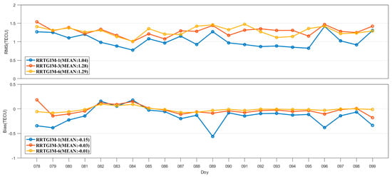 Refinement tests from DOY 78 to 99, 2020, were carried out to further investigate refinement modeling. The average bias and RMS of post-residuals are shown in Figure 10. The average RMS of RRTGIM-1 was 1.04 TECU, which was smaller than the 1.28 TECU of RRTGIM-3 and 1.29 TECU of RRTGIM-6, showing that the model with fewer stations had better internal coincidence accuracy. The average bias of the three models was −0.15, −0.03, and −0.01 TECU, showing that RRTGIM-6 was more stable than RRTGIM-3 or RRTGIM-1.
