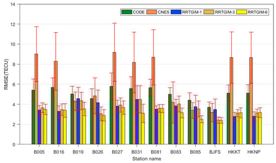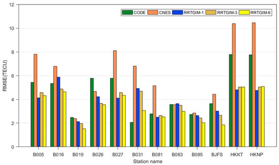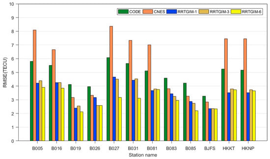 Moreover, to evaluate the accuracy of ionospheric activity time, we conducted comparisons at UT 6:00 DOY 78, 2020. As shown in Figure 12, the average RMSE was 6.11 TECU for CNES, where the maximum was 10.45 TECU for HKNP and the minimum was 2.38 TECU for B019. RRTGIM-1 showed some improvement when compared with CNES. The maximum therein was 5.88 TECU for B016 and the minimum was 2.13 TECU for B019. Moreover, the average RMSE was 3.89 TECU, which was a 36.3% improvement over CNES. For the three refinement models, RRTGIM-6 had the best performance and the average RMSE was 3.41 TECU, which was a 44.1% improvement over CNES. The average RMSE of CODE was 4.6 TECU, which was better than CNES but worse than three refinement models. The improvement was 12.6%, 17.4%, and 25.9% for RRTGIM-1, RRTGIM-3, and RRTGIM-6, respectively.