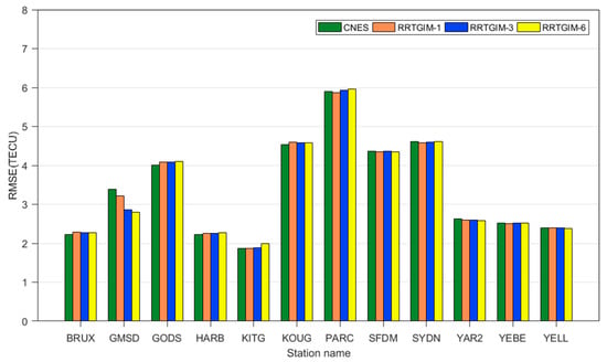 To verify the influence of other regions, we adopted 12 globally distributed stations. RMSE was calculated for each station. As shown in Figure 14, the influence of other regions was very slight. For the 12 stations, the most apparent affected station was GMSD in Japan, where the RMSE was 3.39, 3.22, 2.86, and 2.79 TECU for CNES, RRTGIM-1, RRTGIM-3, and RRTGIM-6. The improvement to CNES was 17.7% for RRTGIM-6. For other stations, the RMSE was almost the same after refinement modeling.