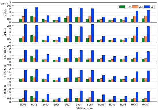 Daily static PPP solution with IGS final product was adopted as the reference. Position errors of RT-SF-PPP are shown in Figure 16. As can be seen, positioning errors of the five ionospheric models on horizontal and vertical components reached submeter-level and meter-level. For CNES, the maximum and minimum error of stations on horizontal was B016 and B081, which were 1.04 and 0.91 m on the north component, and 0.25 and 0.29 m on the east component. For the up component, the maximum and minimum error was 2.69 m on station B081 and 0.61 m on station BJFS. For RRTGIM-1, the average RMSE values on the north, east, and up components were 0.45, 0.51, and 1.39 m. The improvement to CNES was 22.4%, 28.2%, and 24.9%. RRTGIM-3 and RRTGIM-6 had a slightly better performance than RRTGIM-1. The average RMSE values for RRTGIM-3 were 0.44, 0.49, and 1.39 m, and for RRTGIM-6 were 0.42, 0.46, and 1.32 m. The average CODE RMSE was 0.49, 0.62, and 1.56 m, which was better than CNES.
