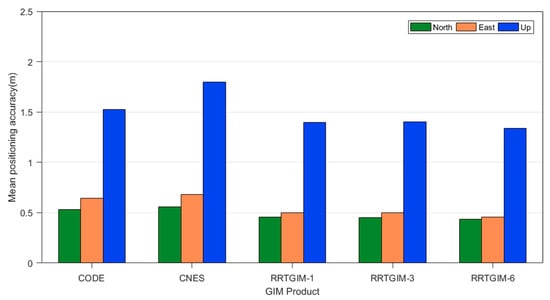 To investigate positioning accuracy using ionospheric models further, RT-SF-PPP was conducted from DOY 78 to 99, 2020. As shown in Figure 17, the average RMSE in 22 days was 0.56, 0.68, and 1.8 m for the three components. CODE performed better than CNES and the average RMSE was 0.53, 0.64, and 1.5 m. RRTGIM-1 also performed better than CNES and CODE, and the average RMSE was 0.46, 0.5, and 1.4 m for the three components. The improvements to CODE were 13.2%, 21.9%, and 7.9%, and for CNES were 17.9%, 26.5%, and 22.2%. Moreover, RRTGIM-3 and RRTGIM-6 were slightly better than RRTGIM-1. The average RMSE of RRTGIM-3 was 0.45, 0.50, and 1.4 m, and for RRTGIM-6 were 0.44, 0.46, and 1.34 m.