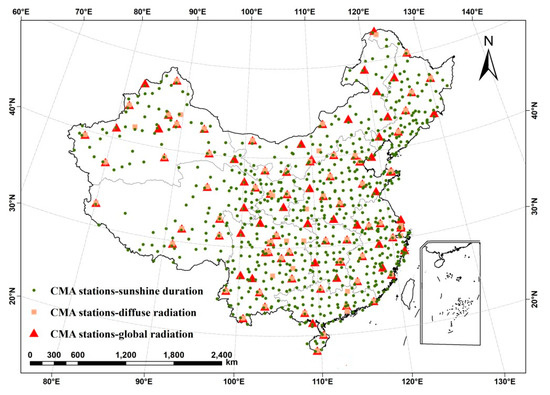 Distribution in China of meteorological stations recording sunshine duration, and global and diffuse radiation.