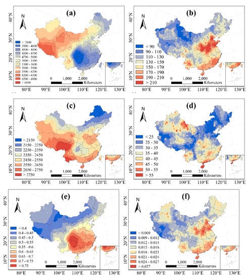 Values of Rd (Figure 2c) ranged from 1989 to 3007 MJ m−2 y−1 and showed a national average of 2483 MJ m−2 y−1, which is close to the value of 2477 MJ m−2 y−1 estimated by Ren et al. [25,30]. The standard deviation range of Rg is 15–101 MJ m−2 y−1 with a national average of 33 MJ m−2 y−1 (Figure 2d). In general, Rd was high in the south and west of China and low in the north. The highest values of Rd were on the Qinghai–Tibet Plateau and on the southwestern part of the Yunnan–Guizhou Plateau, with values higher than 2800 MJ m−2 y−1. The lowest values were found for Northeast China, Inner Mongolia, and Northwest China, with values of less than 2300 MJ m−2 y−1. Values of diffuse radiation fraction ranged from 0.34 to 0.83 and showed a national average of 0.52 (Figure 2e), and the diffuse radiation fraction was highest in southern China, especially within the regions of Sichuan and Guizhou. The standard deviation of diffuse radiation fraction ranged from 0.007 to 0.043 with a national average of 0.016 (Figure 2f).