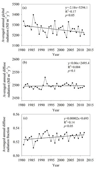 The annual average diffuse radiation fraction in China increased markedly between 1981 and 2012 by 0.0002 y−1 (p < 0.05) (Figure 3c).