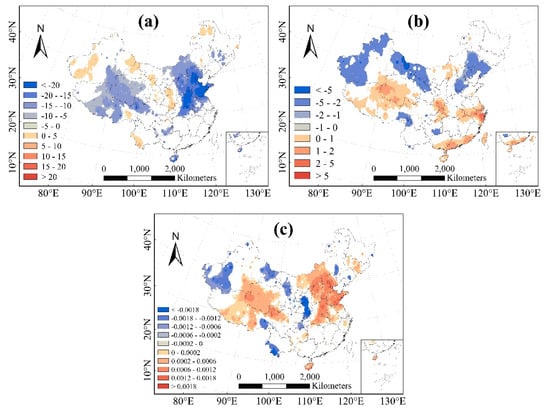 Spatial distribution of the changing rate in annual mean global radiation ((a), unit: MJ m−2 y−1), diffuse radiation ((b), unit: MJ m−2 y−1), and diffuse radiation fraction (c) in China for the period 1981–2012 (white areas show no significant trends; α = 0.05) with a spatial resolution of 0.0727°.