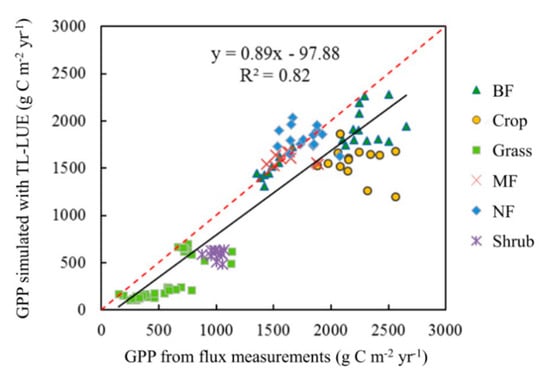 Second, the TL-LUE model has been validated worldwide [42,43,44], showing that the model performance for GPP simulations is satisfactory. In the present study, we obtained a high R2 (0.82) value for comparisons between the model-simulated GPP and observed GPP values. However, an extremely limited number of flux sites in China were used to optimize LUEsun and LUEshaded [43], which would cause their underestimation for some ecosystems, especially for crops. Compared with C3 plants, C4 plants photosynthesize by the combination of vascular bundle sheath cells and mesophyll cells, which have a higher CO2 assimilation rate, resulting in higher LUE [60]. Therefore, the inclusion of a few sites dominated by C4 plants to parameterize the model would result in underestimation of LUEsun and LUEshaded used in the model and the subsequent simulation would underestimate GPP values at some sites in China (Figure 5). Therefore, additional flux tower sites in China should be used to validate the model in the future.