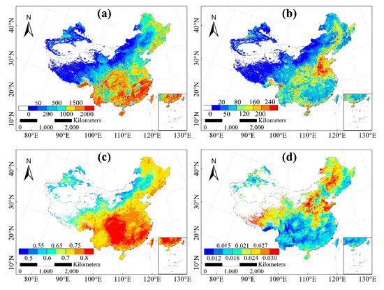 Furthermore, radiation measurements in China are extremely limited, comprising 103 and 81 sites for global radiation and diffuse radiation, respectively; therefore, an interpolation method was used to infer the national-scale Rg and Rd. The Ångström model is commonly used for radiation interpolation [29,30]. Interpolated radiation data are widely used for ecosystem-level simulations of water and carbon dynamics [44,61]. However, because of the limited available measurements, national Rg and Rd were interpolated to 500 m based on daily extraterrestrial radiation and sunshine duration, omitting many of the drivers of dimming and Rd, which would result in Rd and Rg uncertainties, especially in heterogeneous areas.