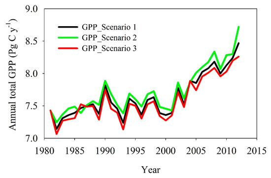 Interannual variation in total annual GPP for the period 1981–2012 in China for three simulations (GPP_Scenario 1; GPP_Scenario 2; and GPPsi GPP_Scenario 3). Scenario 1 assumed that the global radiation and diffuse radiation ratio changed with time; Scenario 2 assumed that global radiation remained unchanged from 1981 to 2012; and Scenario 3 assumed that the diffuse radiation fraction remained unchanged from 1981 to 2012.
