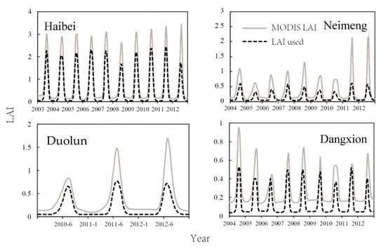 Comparison of leaf area index (LAI) data used in this study and the MODIS LAI product (MOD15A2) for grassland sites, as part of the validation process for estimation of GPP (details for each site were described in Table 3).
