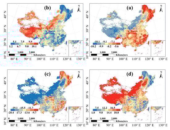 Uncertainties in GPP simulated by the TL-LUE model caused by LAI uncertainties in China during the period 1981–2012 (unit: %). (a) Decrease in GPP simulated with the TL-LUE model (GPPTL) caused by a decrease in LAI by 10%; (b) increase in GPPTL caused by an increase in LAI by 10%; (c) decrease in GPPTL caused by a decrease in LAI by 20% and (d) increase in GPPTL caused by an increase in LAI by 20%.
