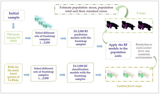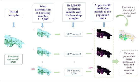 - Estimate mean species-specific V as using Equation (1) and total V, , as the product of the estimates of mean V and the area, , from the original Landsat forest species map,where the subscript “w” indicates that wild bootstrapping was used.
