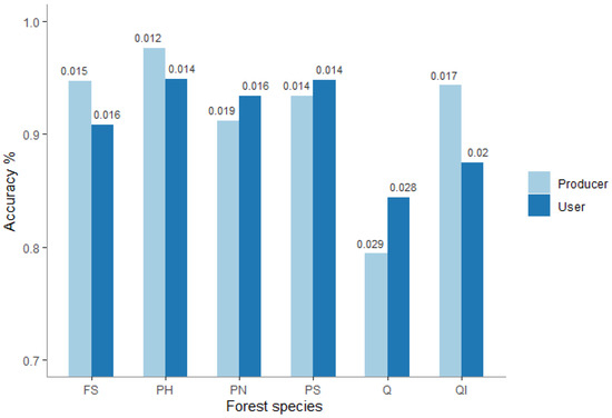 | Forest Species * | User’s Accuracy (%) | Commission Error (%) | Producer’s Accuracy (%) | Omission Error (%) |