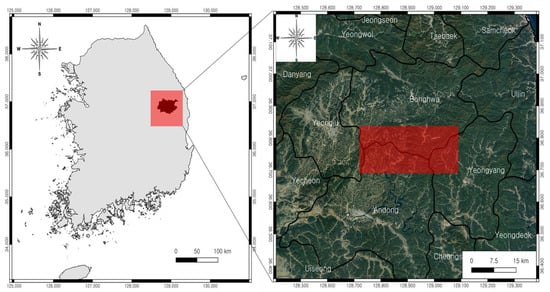 Precise deep learning data are needed to apply deep learning to high-resolution satellite images, to ensure accurate classification of regional attributes. Thus, learning and testing datasets are constructed after satellite image preprocessing. The study areas were selected in consultation with: Ministry of Environment land cover maps (1:5000); Korea Forest Service digital forest cover maps (1:5000) and a mountain forest database (Table 1). The study area is selected near Bonghwa-gun, Gyeongsangbuk-do, which has 19,031 km2 of mountainous area (Figure 4). In addition, according to the data of the Korea Forest Service [], the number of deforestation cases is the highest in the country []. Furthermore, more than half of the forest area is made up of softwood and hardwoods, and more than 70% of them are Softwood.