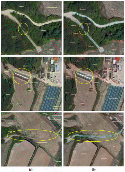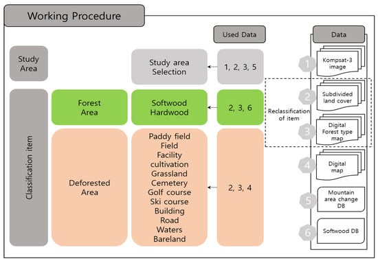 For this study, satellite images and land and forest cover maps were collected as base data, and a continuous digital map (1:5000), mountain forest area database, and softwood database were collected as reference data (Figure 5). The study area was selected to include at least 50% forest. Land cover classification was performed of items that were visually distinct on the satellite images. Primary classification consisted of dividing the data into forest and non-forest areas, after which forest areas were subdivided into softwood and hardwood and non-forest areas were subdivided into buildings, farmland, and bare land, resulting in a total of 13 cover types (Table 2). Detailed revision of the data included corrections such as the elimination of roads blocked by trees in the satellite images (Figure 6).