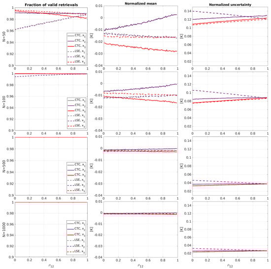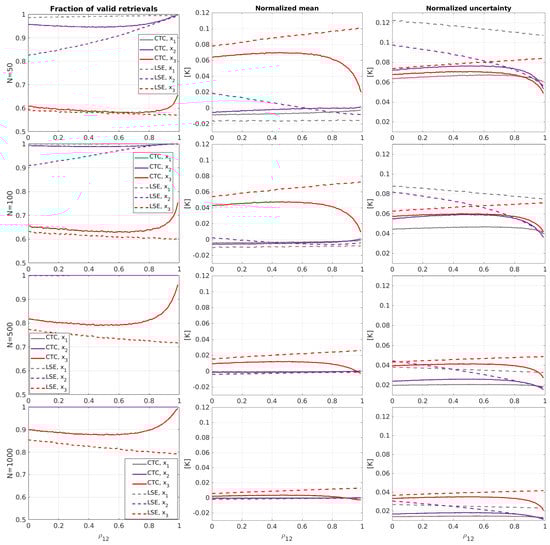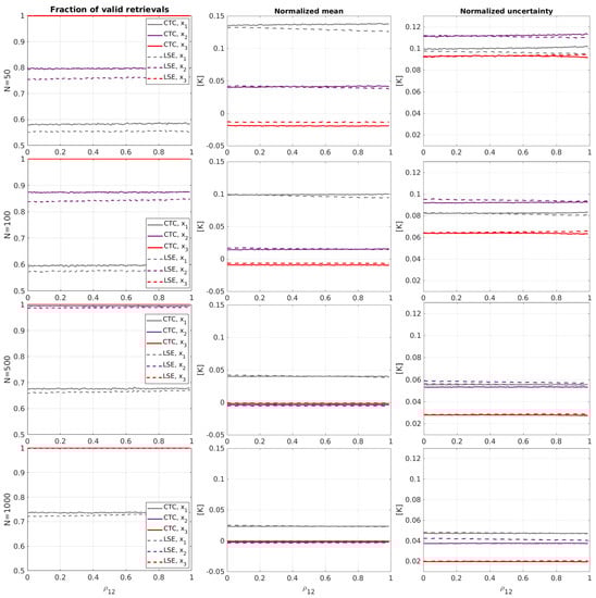 - The fraction of valid points is very large even for scarce samplings () for the measurements with the largest error standard deviations. The number of valid retrievals for the “small uncorrelated case” and “large uncorrelated case” is lower for the measurement with the lowest error standard deviation: in the range of 60% for scarce sampling and increasing slowly for larger sampling sizes. CTC has in general a larger number of valid retrievals than LSETC, especially in the “small uncorrelated case” and less in the “large uncorrelated case”. The fractions of valid points for LSETC and CTC are very similar in the “equal case”.