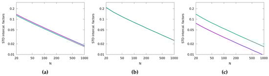 Log-log plot of the standard deviation of the intercalibration factors as a function of the sampling size N: purple represents the standard deviation of , and green represents the standard deviation of . (a) The results for case 1, (b) the results for case 2, and (c) the results for case 3.