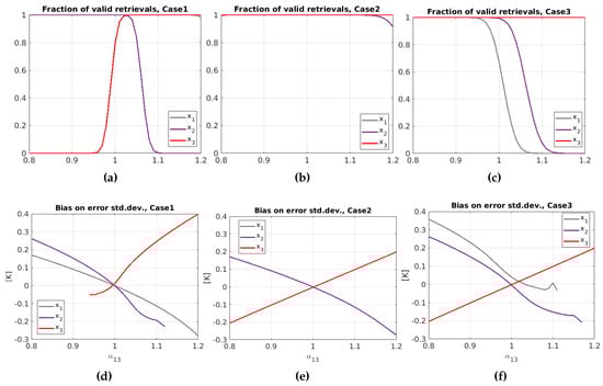 As evidenced by the curves of valid retrievals (bottom plots in Figure 5), when the bias induced by the change in is close to a critical value when would go to zero, there is a sudden drop in the fraction of valid retrievals. Therefore, the number of valid retrievals is a good indicator of having problems with the intercalibration factors. The transition points depend on the ratio between the error standard deviation and one of the signal. In our figures, the drops happen at percentages of variation of the intercalibration factor that are equal to the standard deviation of the error of the affected measurement; this is not a coincidence but a consequence of the variance 1 for the signal. A signal with larger variance will have transition points at lower values of the percentage of miscalibration. When working with real signals, as the variance of the errors is typically much smaller than that of the signal, the range of admissible errors in the intercalibration factor is quite narrow in practice.