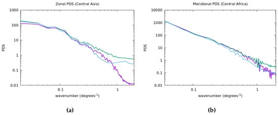 Log-log plots of the Power Density Spectra (PDS) of the three datasets: green represents Soil Moisture and Ocean Salinity (SMOS) nominal, blue represents SMOS nodal sampling (NS), and purple represents Soil Moisture Active Passive (SMAP). (a) Central Asia and (b) Central Africa.