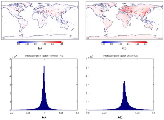 (a) Map of the intercalibration factor between SMOS nominal and SMOS NS (), (b) map of the intercalibration factor between SMOS NS and SMAP (), (c) histogram of , and (d) histogram of .