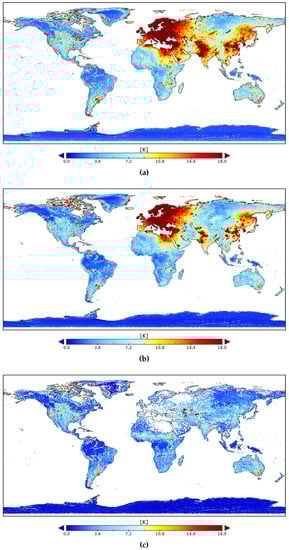 Maps of the adjusted error standard deviation of TB () over land: (a) SMOS nominal (mean error std: 7.62 K and gaps: 0.05%,), (b) SMOS NS (mean error std: 6.62 K and gaps: 0.29%), and (c) SMAP (mean error std: 3.2 K and no gaps per construction).