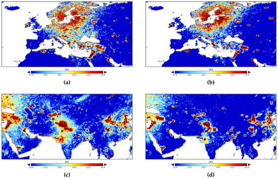 The L1B Radiometer Half-Orbit Time-Ordered Brightness Temperatures, Version 3 product (Composite Release Identifier R13080) [] has been used for generation of the SMAP TB maps. The horizontally and vertically polarized brightness temperatures at the surface of the Earth after on-board RFI filtering are used in this analysis, averaging the fore- and aft-look samples []. No additional filter has been applied to SMAP TBs, that is, all measurements have been considered (also if the on-board software was unable to correct the brightness temperature when an RFI is detected).