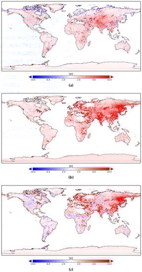 Maps of the difference between the error standard deviation of TB (a) SMOS nominal-SMOS NS (mean difference: 1.03 K), (b) SMOS nominal-SMAP (mean difference: 3.41 K), and (c) SMOS NS-SMAP (mean difference: 2.28 K).