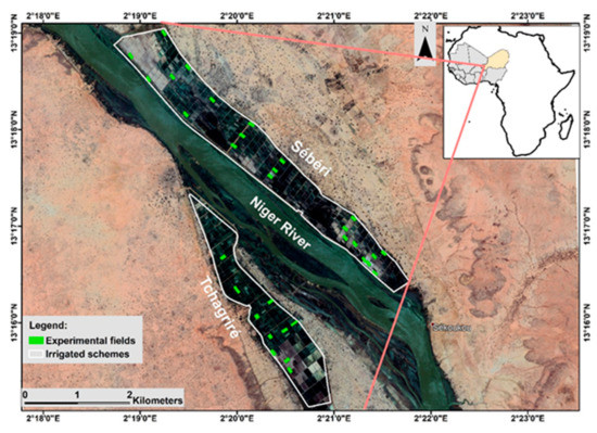 The study area corresponded to the irrigated systems of Sébéri and Tchagriré (6.5 km2), located in the Niger River basin 50 km southeast of Niamey, the capital of Niger (13°16′35.32″ N, 2°21′31.81″ E) (Figure 1). The climate of the area corresponds to the dry tropical zone of the Sudano–Sahelian type. Annual precipitation has high spatial, temporal and interannual variability and a general trend towards a southward shift of isohyets over the past 30 years. Mean annual precipitation is ca. 510 mm/year (standard deviation (SD) = 100 mm/year) (National Meteorological Service of Niger). Precipitation is irregularly distributed in space and time: it peaks in August (150 mm) and is lowest in October (22 mm) and May (20 mm). Mean monthly temperature is 36 °C during the hottest period (April), with a maximum temperature of 47 °C. Minimum mean monthly temperatures are 25 °C and are observed from December to January. Evaporation varies from 1700 to 2100 mm/year. The water deficit is thus large during the dry season and is accentuated by the Harmattan, a dry continental trade wind from the Sahara. Consequently, the study area has two seasons: a dry season from October to May and a wet season from June to September [17].
