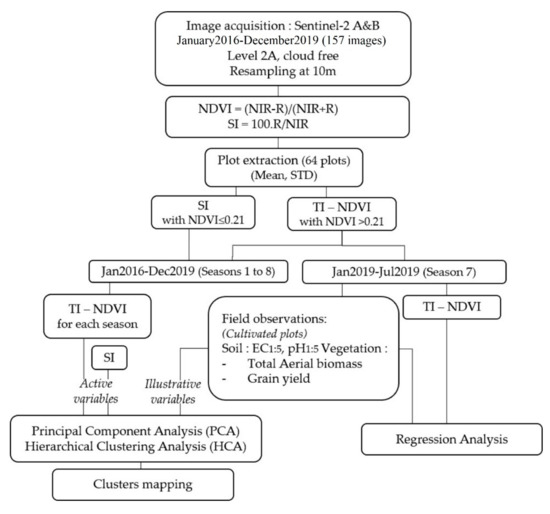 This study aimed to develop a method to detect potential areas of soil salinity using multi-spectral and high-resolution Sentinel-2 satellite images combined with field data using two complementary approaches: (i) observing salinity of bare soil using the SI and (ii) monitoring vegetation behavior from 2016–2019 (eight growing seasons) in the arid zone of the Niger River basin. The study involved a four-year time series of Sentinel-2 remote-sensing images and field measurements of biomass and topsoil characteristics of cultivated rice fields.