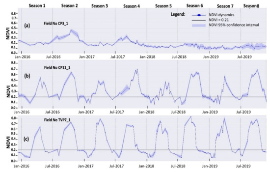 Example of dynamics of mean NDVI for three fields over eight growing seasons from January 2016 to December 2019: (a) Field CP3_1, cultivated in season 2 but not in the other seasons; (b) Field CP11-1, always cultivated but with lower NDVI in dry seasons than wet seasons; and (c) Field TVP7, always cultivated and with high NDVI in both dry and wet seasons. For each field, mean NDVI and its 95% confidence interval were estimated from the field’s ca. 25 pixels.