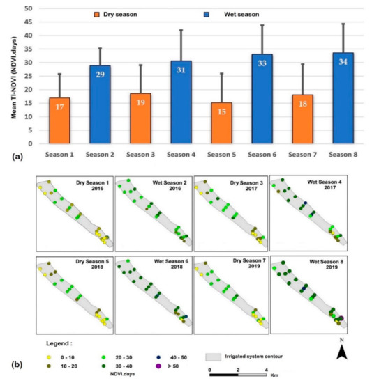 Temporal and spatial variations in the time-integrated normalized difference vegetation index (TI-NDVI) for the 44 fields of the Sébéri irrigation system: (a) mean and standard deviation of TI-NDVI for each season; (b) maps of TI-NDVI estimated for the eight growing seasons.