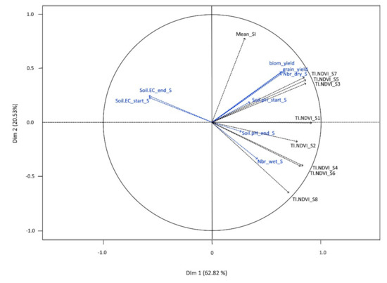 First plane of principal component analysis with variables derived from remote sensing as active variables (black) and soil and vegetation variables as illustrative variables (blue). Abbreviations: TI-NDVI_SN: time-integrated normalized difference vegetation index for season N; Mean_SI: mean salinity index; biom_yield: biomass yield at harvest; grain yield: grain yield at harvest; Soil EC_start_s: soil electrical conductivity at the start of the season; soil EC_end_s: soil electrical conductivity at the end of the season; soil pH_start_s: soil pH at the start of the season; Soil pH_end_season: soil pH at the end of the season; Nbr_dry_s: number of dry growing seasons during the time series; and Nbr_wt_s: number of wet growing seasons during the time series.