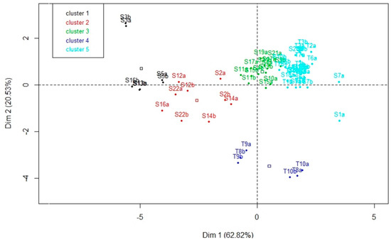 Representation on the first plane of principal component analysis (PCA) of the five clusters of fields defined by ascending hierarchical classification applied to the first three axes of the PCA. Points are labeled with field codes starting with S or T respectively for Seberi or Tchagrire irrigation system, while squares indicate barycenters of clusters.